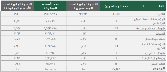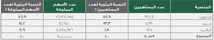 بلـغ عـدد المسـاهمين فـي الشـركة ( 40,159) مسـاهمًا كمـا بتاريـخ 31/12/2025، كما أن رأس مـال الشـركة المصـرح بـه والمدفـوع (100) مليـون دينـار (100) مليـون سـهم بقيمـة دينـار أردنـي للسـهم الواحد.