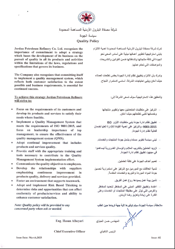 تهتم شركة مصفاة البترول الأردنية بالشكاوى والاقتراحات المقدمة من جميع الأطراف التي لها علاقة بمنتجات الشركة ونشاطاتها المختلفة وتبذل باستمرار مجهوداتها لحل أي مشكلة يتعرض لها متلقي الخدمة ومتابعة اي اقتراح مقدم منه وتحرص على إرضائه.