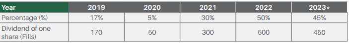 The following table shows the net profits and Cash dividends and shareholders’ Equity for the last five years 2019-2023:
